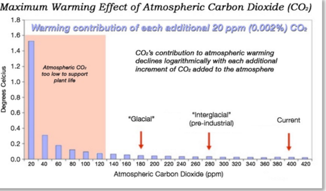 How high do you think those bars will be for CO2 levels of 800 and beyond? They are already over-represented for illustration. As CO2 in the atmosphere increases, the warming contribution approaches zero (though it will never reach zero).